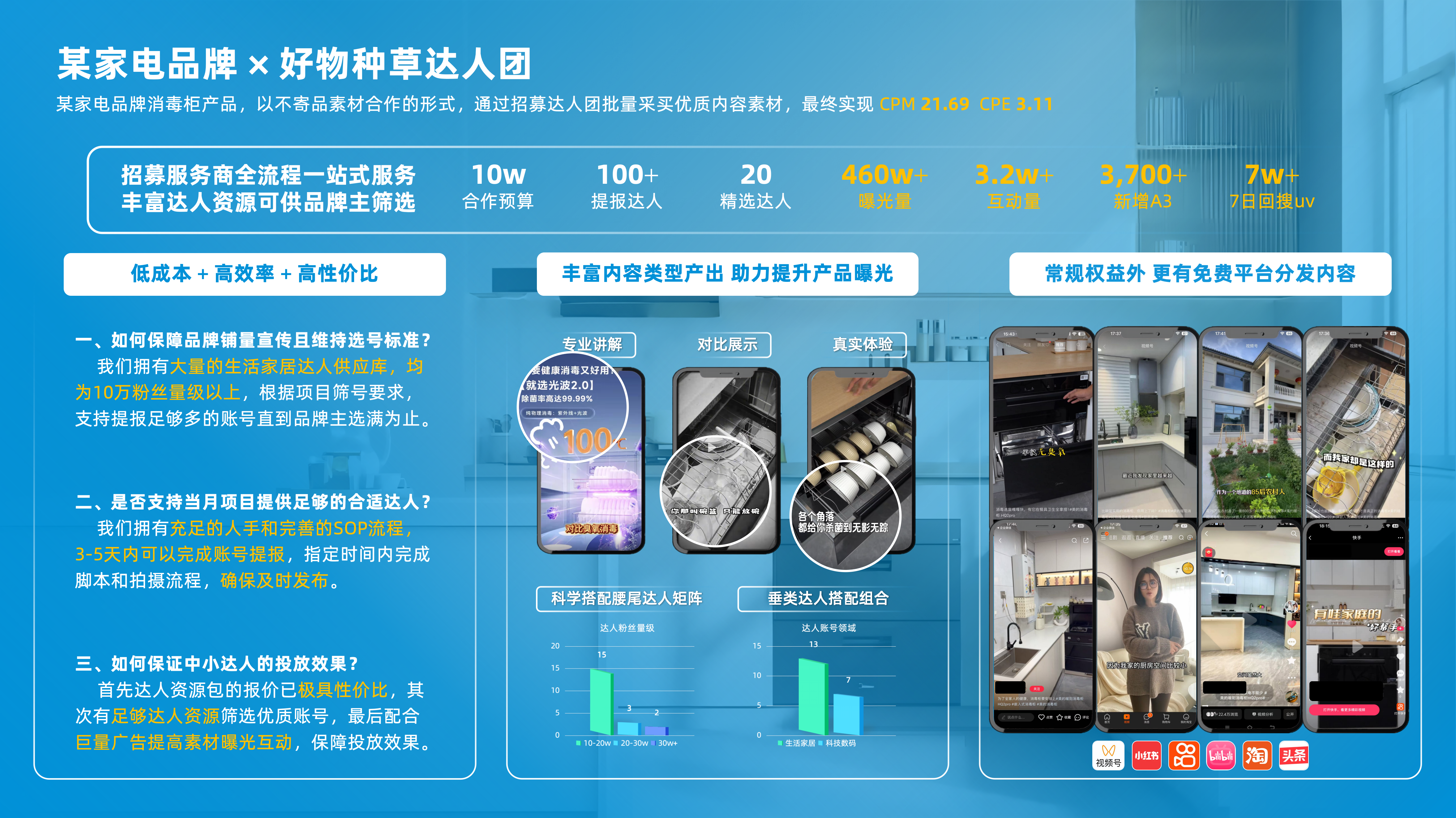 某家电品牌以不寄品素材合作的形式,通过招募达人团批量采买优质内容素材。最终实现 CPM 21.69 、CPE 3.11。
